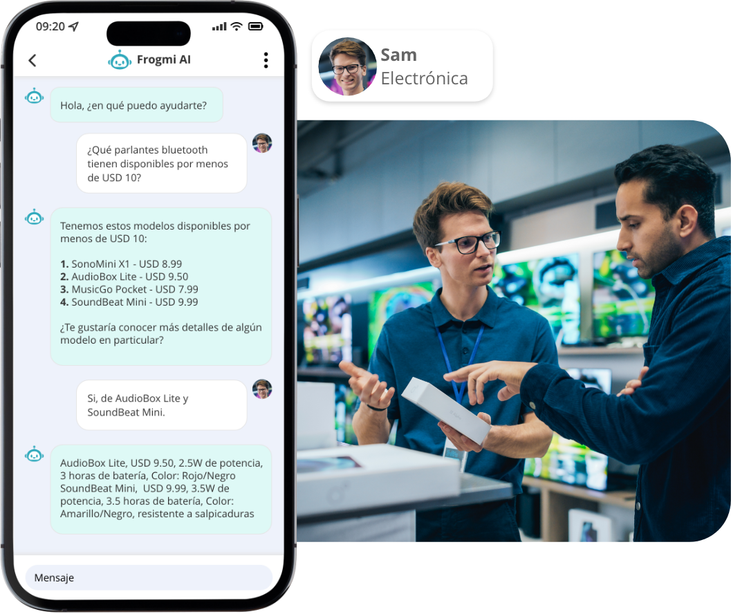 Frogmi despliega asistentes IA que unifican documentación corporativa, datos de productos y expertise de ventas. Respuestas inmediatas en lenguaje natural, contextualizadas según rol y ubicación.
