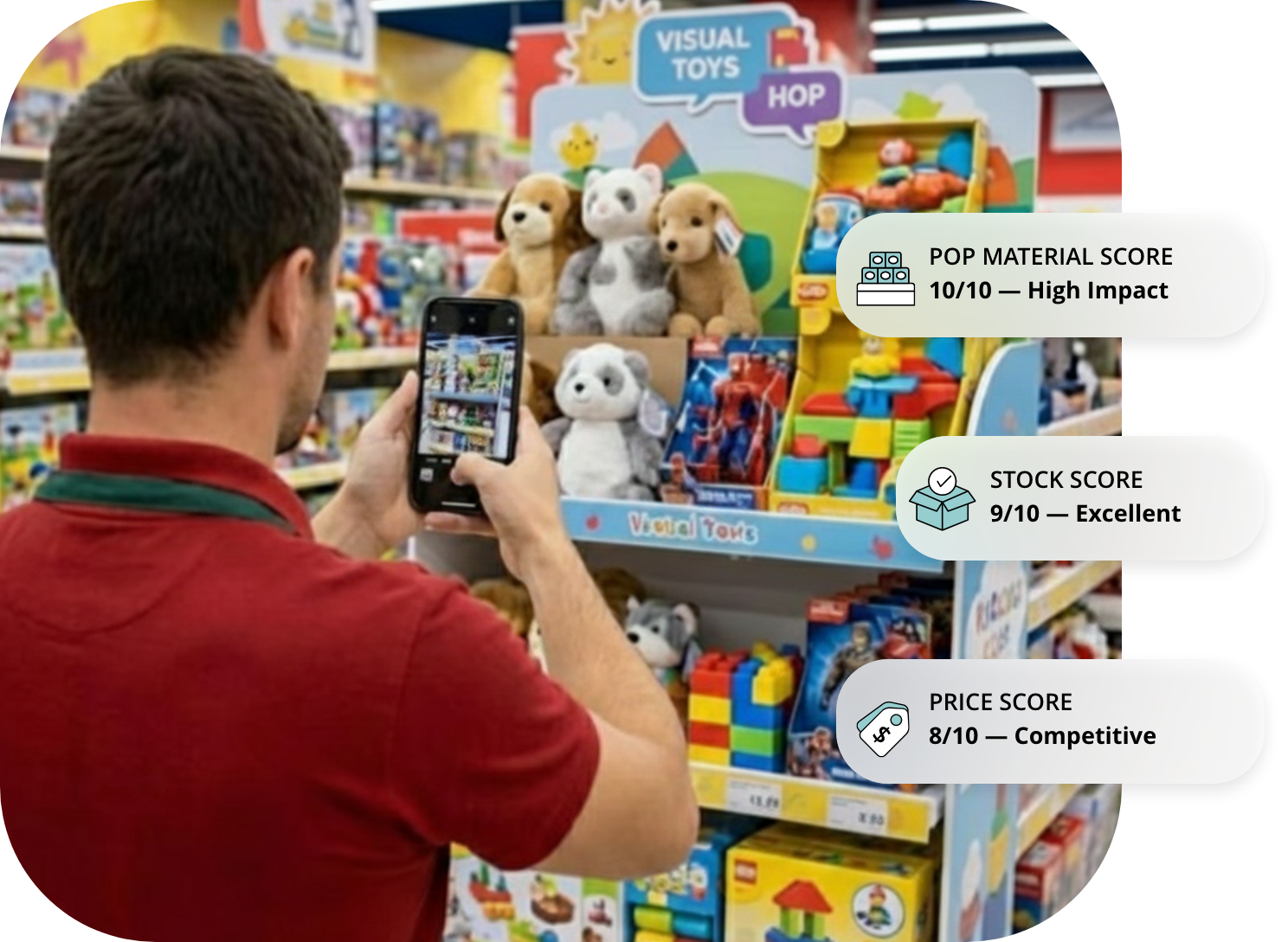 El equipo en tienda captura la foto de la exhibición, y la IA verifica si todos los elementos están presentes. Obtienes un índice de cumplimiento inmediato para cada implementación. Si una exhibición está incompleta o mal ejecutada, permite generar una tarea de corrección, asegurando que tu inversión en activaciones se traduzca en impacto real.