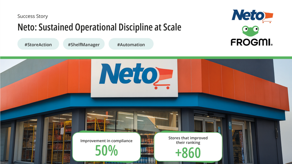 To automate their methodology and achieve complete visibility, they implemented Frogmi to digitize their classification and audit model. Through this implementation and the ability to generate automatic corrective tasks, Neto achieved a 50% improvement in execution compliance and successfully upgraded the classification of more than 860 stores.