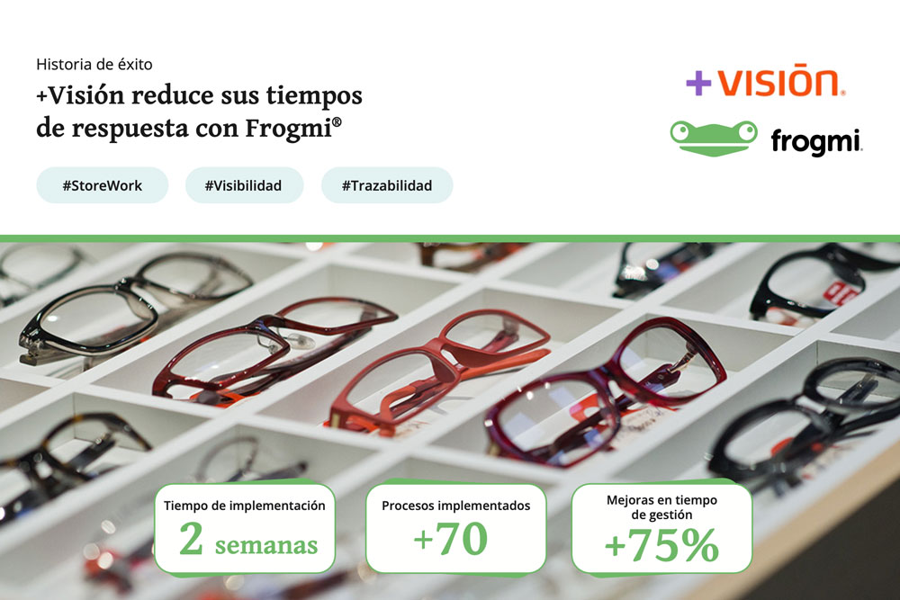 +Visión es una cadena de ópticas presentes en México desde 2012. Hoy cuenta con más de 450 tiendas en todo el país. A través de su lema “Más Visión por menos precio”, ofrece a sus clientes “la mejor relación precio-calidad con el mejor servicio posible.”Con el objetivo de mejorar el servicio a sus clientes, +Visión se ha comprometido a optimizar los tiempos de respuesta e información provenientes de sus unidades de backoffice. Para lograrlo, la gerencia determinó la necesidad de contar con una herramienta que apoyara la comunicación, gestión y seguimiento de los requerimientos entre las tiendas y las áreas de soporte.Gracias a la implementación de StoreWork y al esfuerzo conjunto entre +Visión y Frogmi, después de un año, han implementado exitosamente más de 70 procesos y mejorar los tiempos de gestión en +75%.